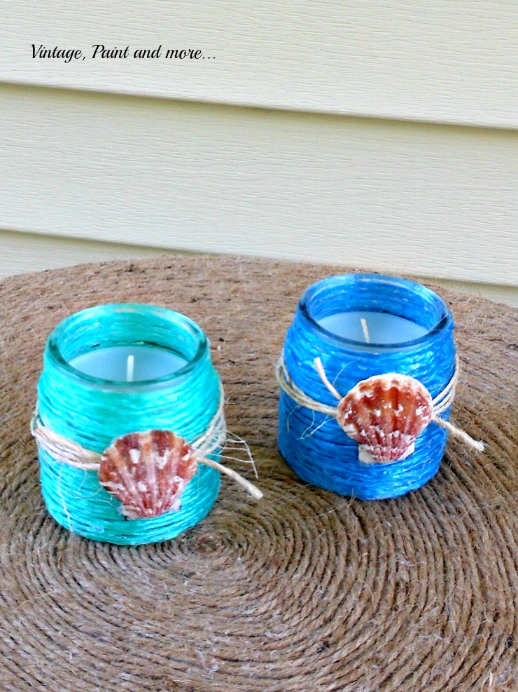 Then I added a little bit of twine by winding it around and tying it in place. I glued a shell over the knot and wallah - you have a very cute little votive to use on your beach inspired patio or any where that you like.